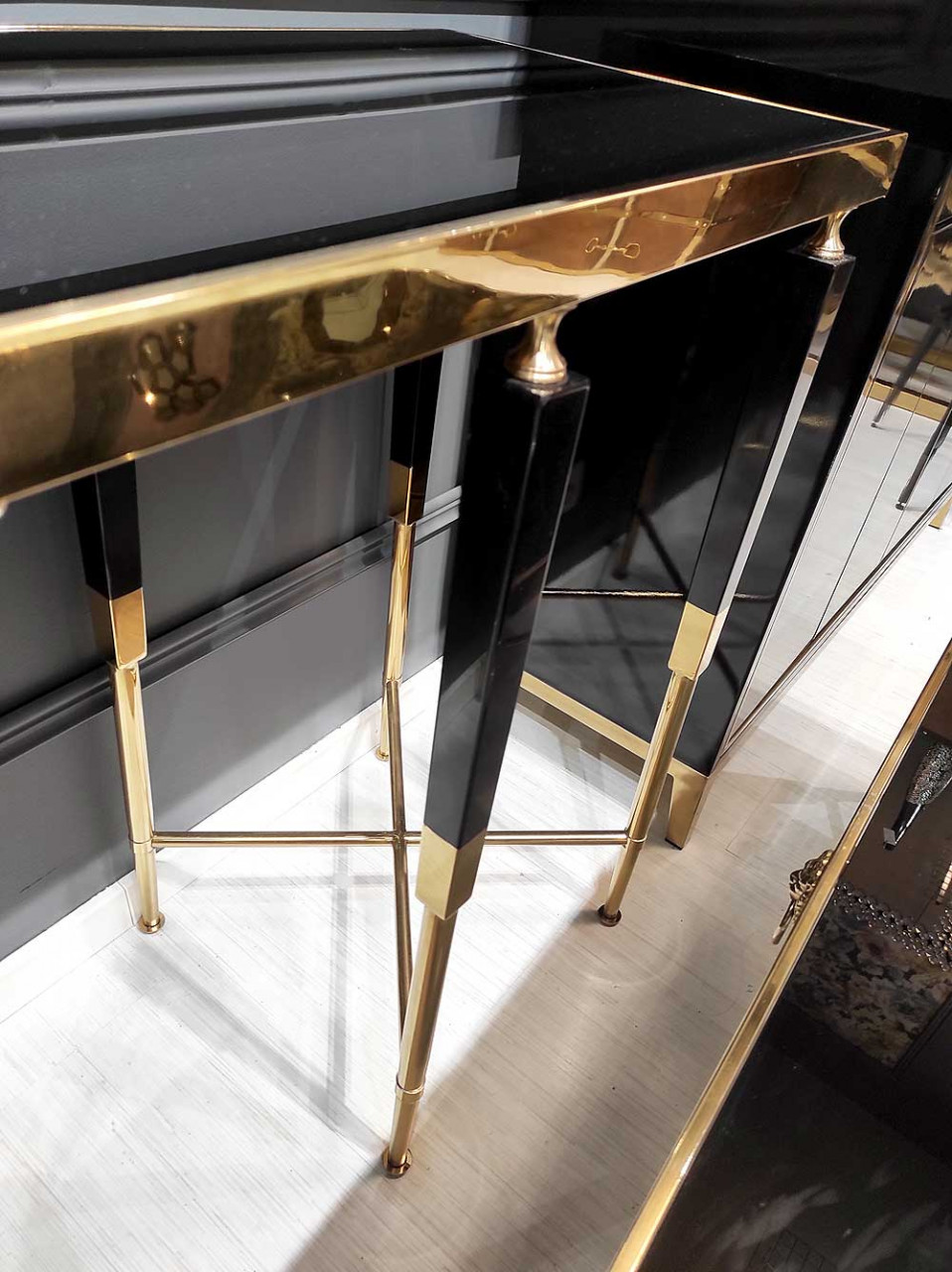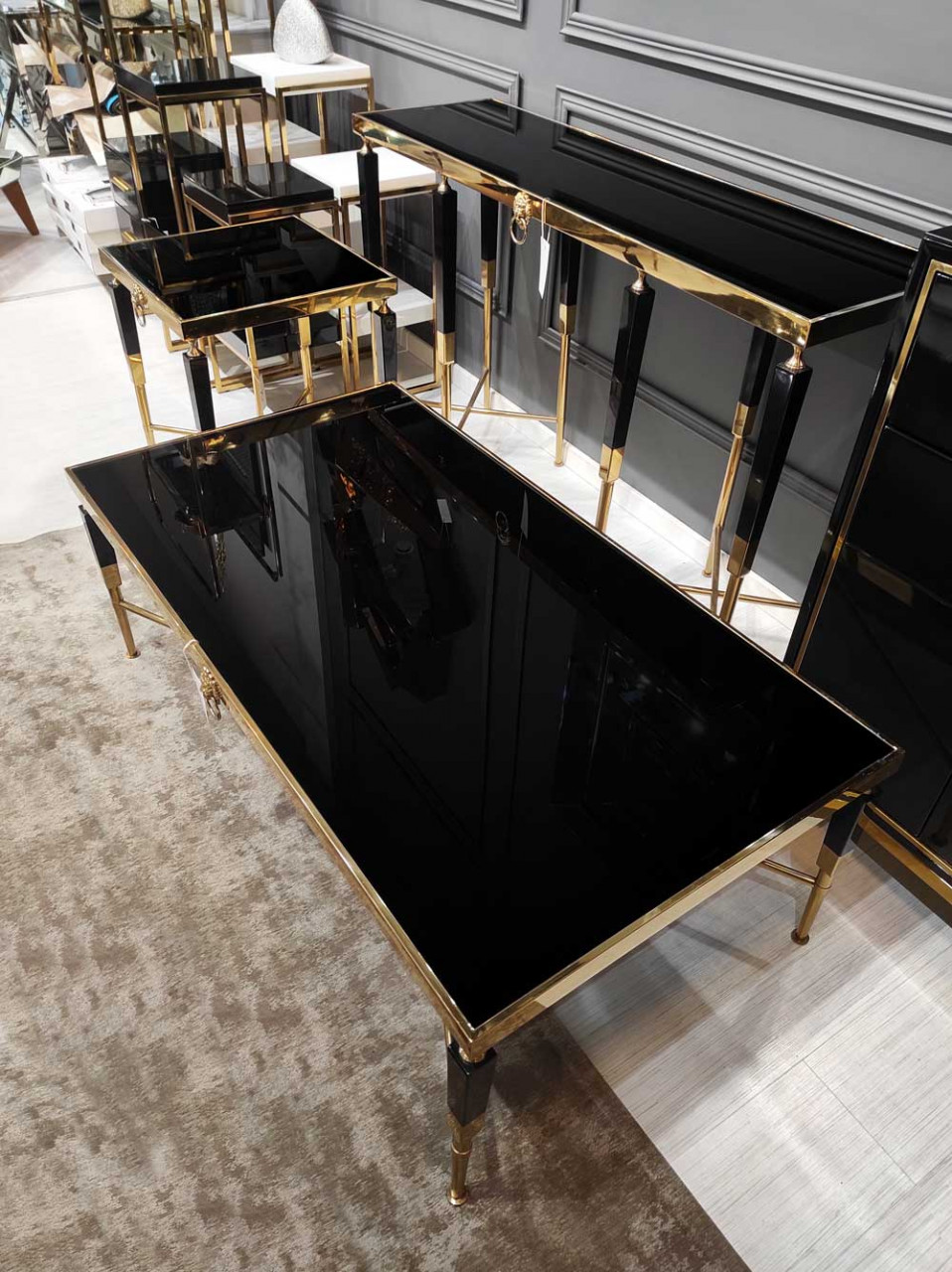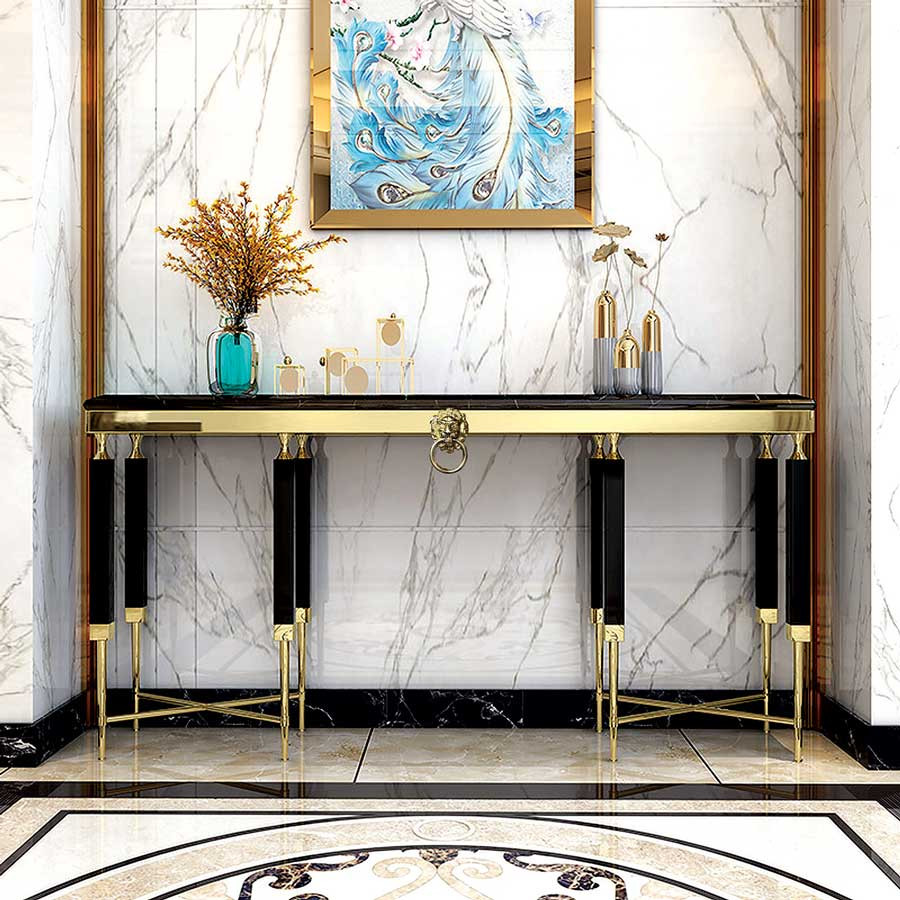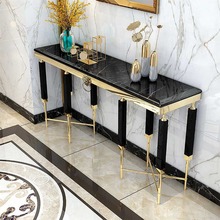 Consola Monaco negru/gold – H85 cm Consola Monaco fermecatoare si eleganta, va diversifica amenajarea livingului dumneavoastra. Consola Monaco este unica, datorita materialelor de cea mai inalta calitate si se va potrivi cu interioarele decorate în diverse stiluri, inclusiv glamour. Pe langa rolul sau decorativ indeplineste si sarcini extrem de functionale. Detalii tehnice: Material: Otel inoxidabil si sticla securizata Material picioare: Otel Culoare picioare: Gold Culoare: Alb Inaltime: 85 cm Latime: 40 cm Lungime: 140 cm Produsul nu este montat, este destinat pentru auto-asamblare. Instructiunile de montaj vin in colet.