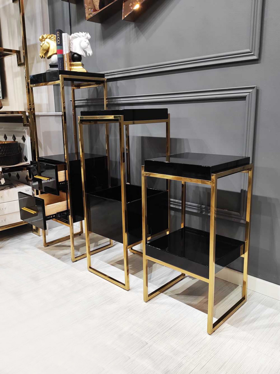 Consola Rodez III negru/gold – H103 cm Consola Rodez este perfecta pentru interioare decorate intr- un stil glamour sau modern . Consola va completa perfect decorul oricărui dormitor sau living decorat într-un stil glamour. Dulapul este dotat cu sertare, astfel incat pe langa rolul sau decorativ indeplineste si sarcini extrem de functionale. Dimensiuni: 103 cm 30 cm 33 cm Latime: 30 cm Lungime: 33 cm Inaltime: 103 cm Detalii tehnice: Cadrul este realizat din: otel inoxidabil Blatul: MDF Produsul nu este montat, este destinat pentru auto-asamblare. Instructiunile de montaj vin in colet.
