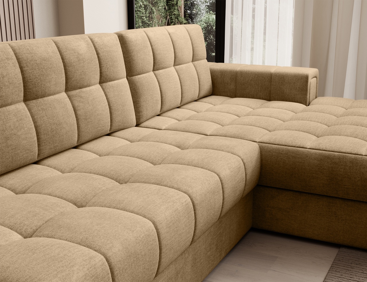 Colțarul Blezalt este o combinație perfectă de design modern, funcționalitate și confort. Dimensiunile sale de 240x150x82 cm oferă spațiu generos pentru relaxarea zilnică, iar funcția de dormit și lada pentru lenjerie îl fac o alegere ideală pentru orice interior. Șezutul din spumă poliuretanică T2540 și arcurile ondulate tip B asigură confort, iar umplutura din spumă a spătarului se adaptează corpului, oferind susținere optimă. atorită mecanismului de extindere tip Delfin, colțarul se transformă în câteva secunde într-un pat confortabil, iar lada de depozitare permite păstrarea textilelor suplimentare. Spatele tapițat oferă un aspect elegant din orice unghi, iar picioarele negre din plastic adaugă stabilitate și lejeritate. Ideal pentru sufragerie, camera de zi și interioarele moderne - oferă confort și stil. Dimensiuni: Lungime: 240 cm Adâncime: 150 cm Înălțime: 82 cm Adâncime șezut: 56 cm Înălțime șezut: 42 cm Dimensiuni picioare: 2,5 cm Suprafață de dormit: 124x215 cm Dimensiunile recipientului de lenjerie de pat: 134x77x18cm Produsul este personalizabil, culoarea produsului și materialul se aleg pe baza paletarelor. Prețul poate suferi modificări în funcție de materialul ales. Produsul nu este montat, este destinat pentru auto-asamblare. Instrucțiunile de montaj vin în colet.