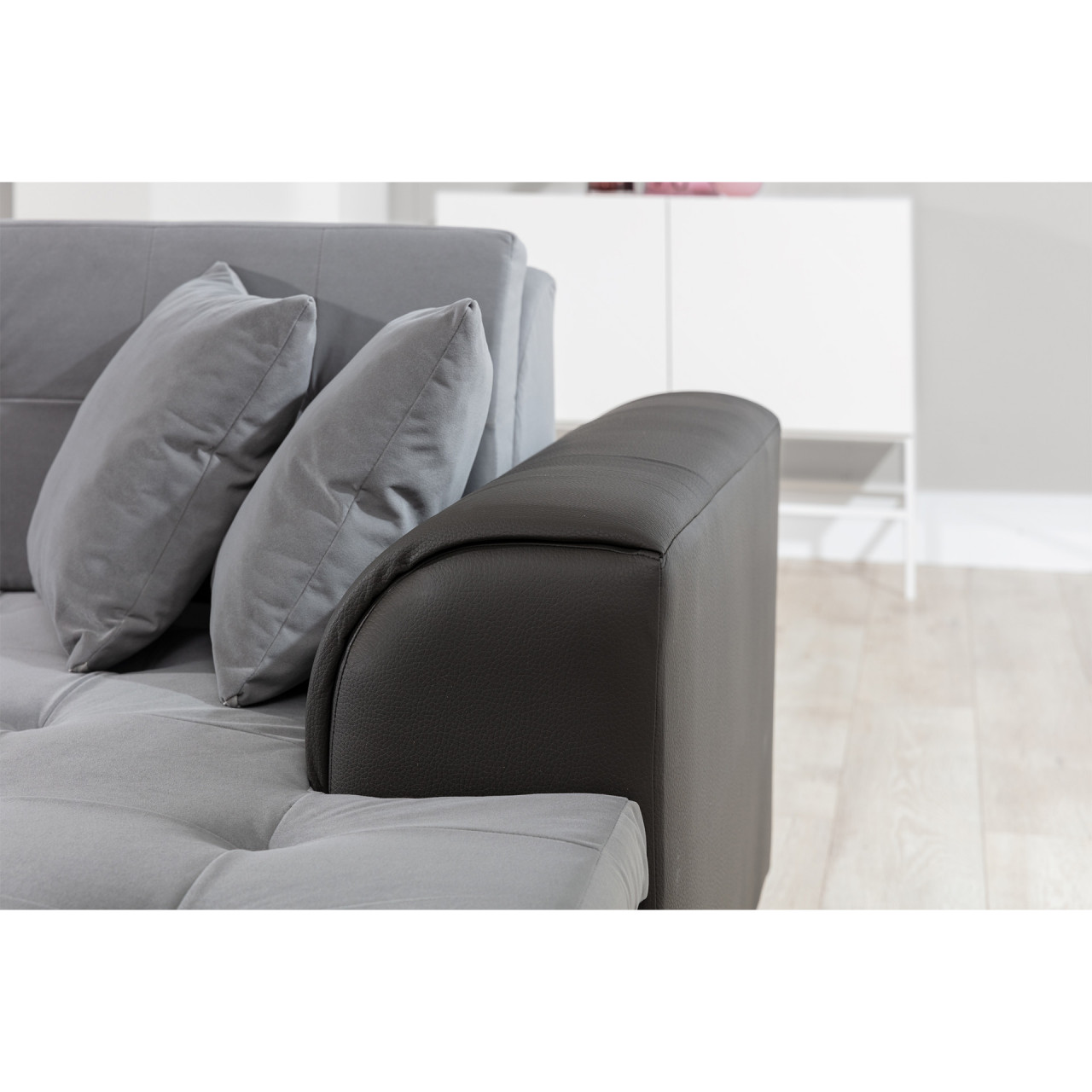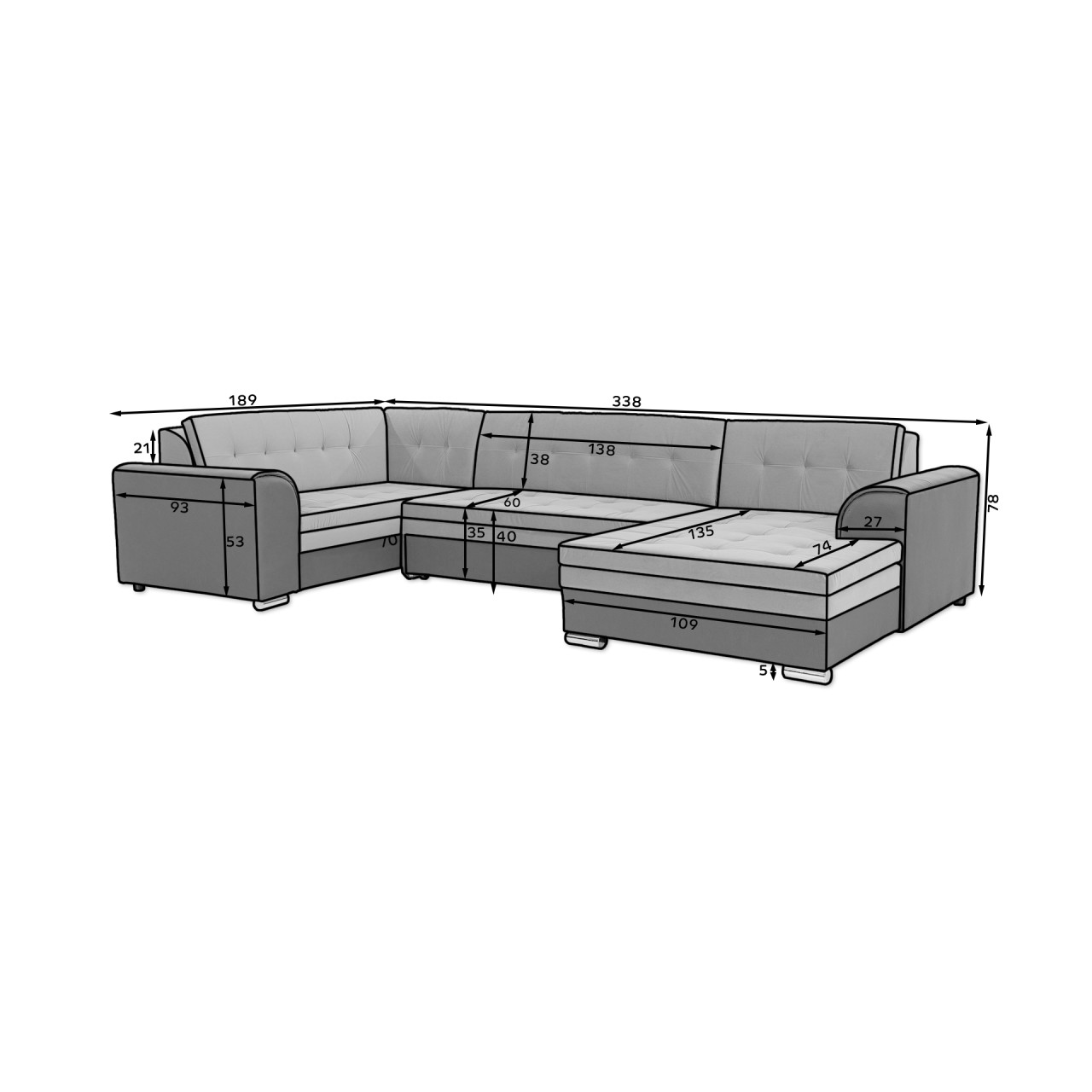 Damario este un colțar spațios, deosebit de elegant și rafinat, de dimensiuni considerabile, măsurând 338x189x78 cm. Această piesă de mobilier în formă de U are un șezut confortabil și moale, realizat din arcuri ondulate durabile, precum și spumă flexibilă T30, rezistentă la deteriorări, deformări și orice tip de zgârieturi. În plus, este echipat cu funcție de dormit. Suprafața destinată acestui scop, obținută printr-un mecanism tip „delfin”, automat și intuitiv, are dimensiunea de 275x126 cm. Dimensiuni: Lungime: 338 cm Adâncime: 189 cm Înălțime cu perne: 78 cm Înălțime fără perne: 76 cm Adâncime șezut: 60 cm Suprafață de dormit: 275x126 cm Produsul nu este montat, montarea este rapidă și ușoară. Produsul este personalizabil, culoarea și materialul se aleg pe baza paletarelor la cererea clientului. Prețul poate suferi modificări în funcție de grupa de material aleasă.