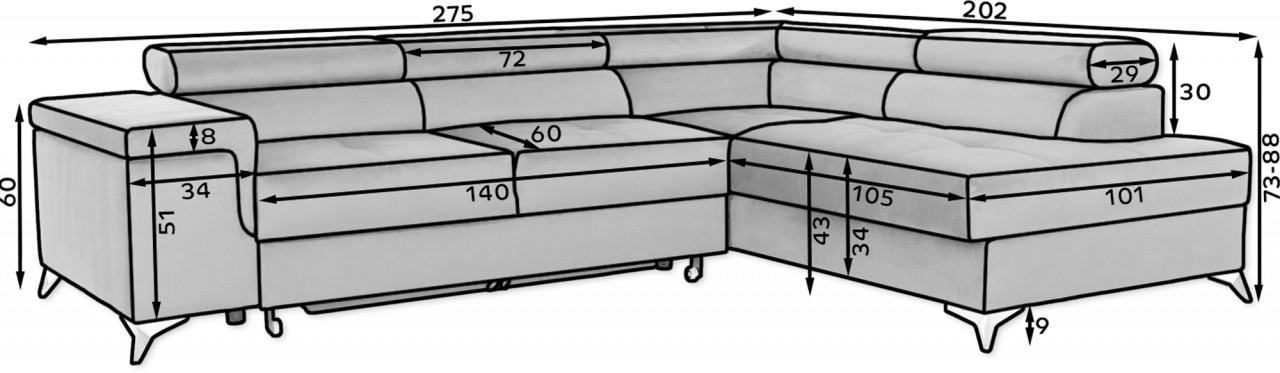 Colțarul Eridano este opțiunea perfectă pentru tine dacă ești în căutarea unei piese de mobilier originală care să se remarce printr-un design interesant, de cea mai înaltă calitate și confort excepțional. Fiind o piesă de mobilier premium, este foarte rezistentă, realizata din materiale de cea mai înaltă calitate. Colțarul Eridano este un colțar foarte confortabil, ideal pentru spațiile generoase. Are formă de L și este o opțiune elegantă pentru economisirea spațiului. Funcționalitate și confort la cel mai înalt nivel. Lățime colțar: 275 cm Lungime colțar: 202 cm Înălțime cu perne: 88 cm Înălțime fără perne: 73 cm Adâncime șezut: 60 cm Înălțime șezut: 43 cm Suprafața de dormit: 205x125 cm Produsul este personalizabil, culoarea produsului și materialul se aleg pe baza paletarelor. Prețul poate suferi modificări în funcție de materialul ales. Produsul nu este montat, este destinat pentru auto-asamblare. Instrucțiunile de montaj vin în colet.
