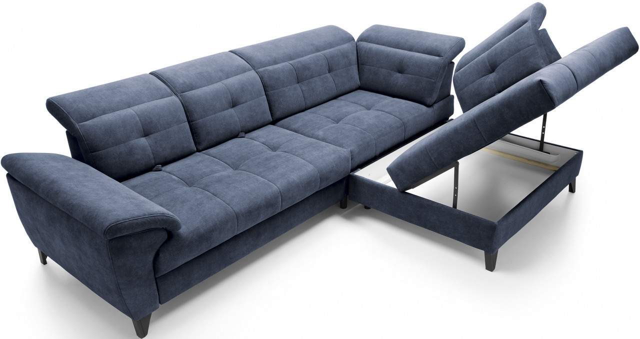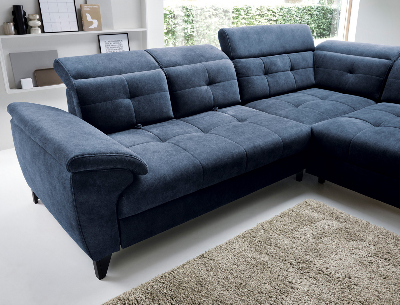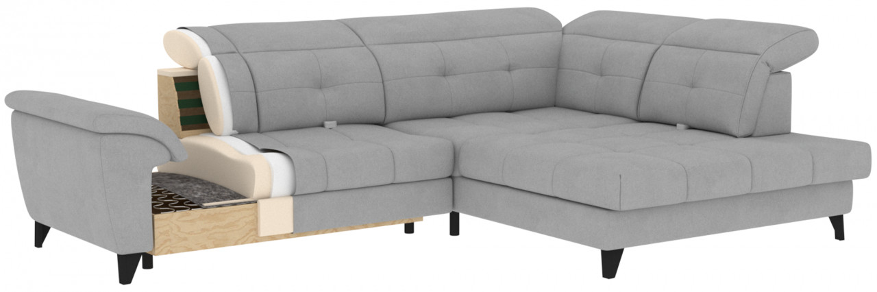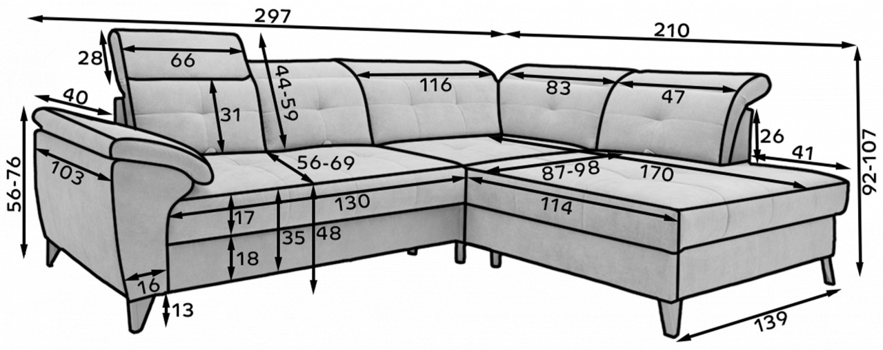 Colțarul Inferne în formă de L asigură atât funcționalitate cât și estetică. Această piesă de mobilier elegantă a fost concepută având în vedere confortul și stilul modern, datorită cărora este capabilă să ofere utilizatorului o serie de funcții inovatoare. Mecanismul Dolfin, reglarea tetierei și spătarul glisant vă permit să reglați mobilierul după preferințele voastre individuale, asigurând confort maxim în timpul odihnei. Lățimea produsului: 297 cm Adâncimea produsului: 210 cm Înălțimea produsului: 107 cm Adâncimea scaunului: 56-69 cm Înălțimea scaunului: 48 cm Dimensiuni picioare: 13 cm Greutate: 197 kg Greutate maximă autorizată: 370 kg Zona de dormit: 128x225 cm Tip arc: Arc ondulat tip B Șezut/spătar: spuma HR + T2130 Tip mecanism: Tip Delfin Material picioare: Metal - negru Produsul nu este montat, montarea este rapidă și ușoară. Produsul este personalizabil, culoarea și materialul se aleg pe baza paletarelor la cererea clientului. Prețul poate suferi modificări în funcție de grupa de material aleasă.