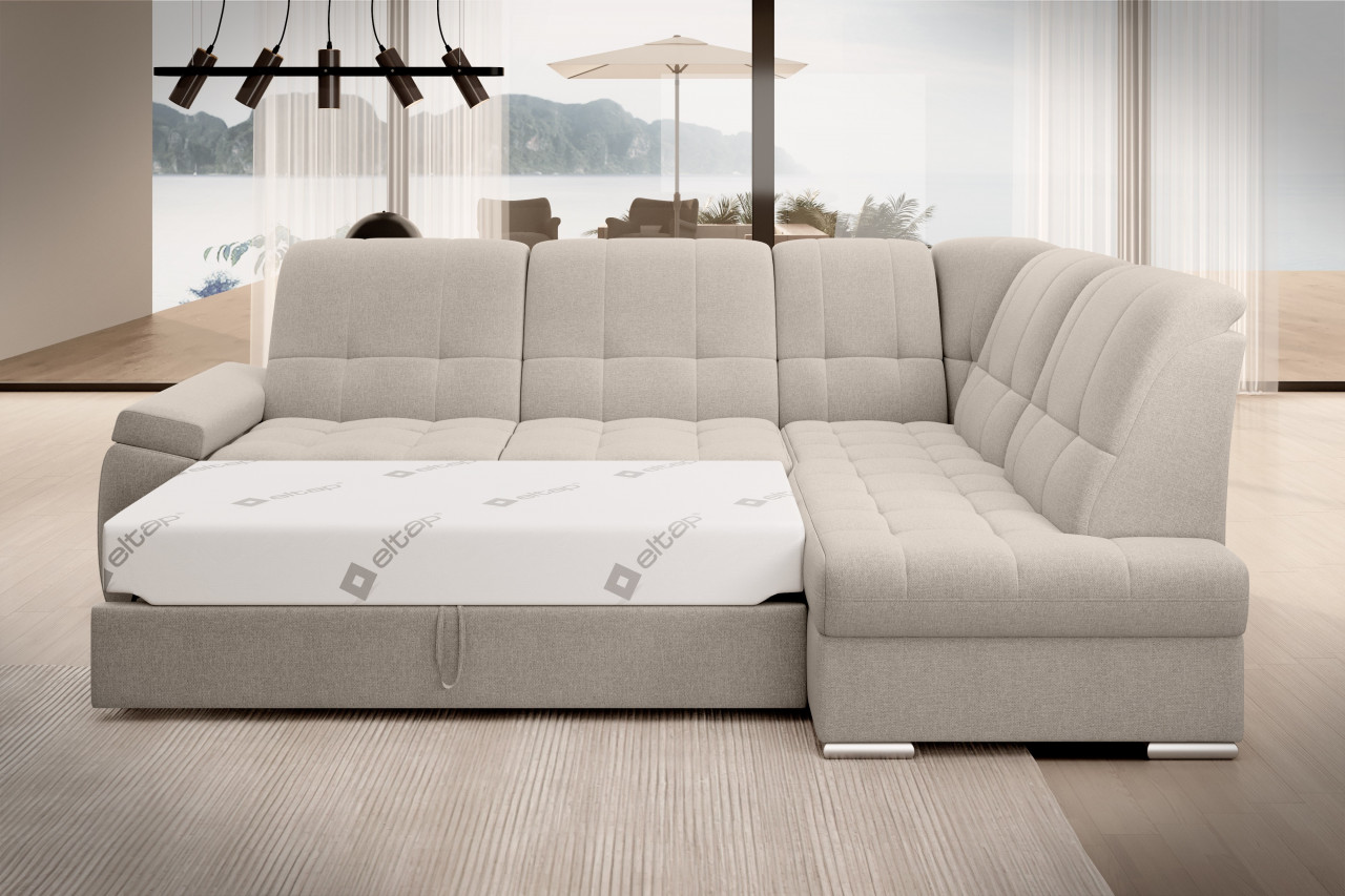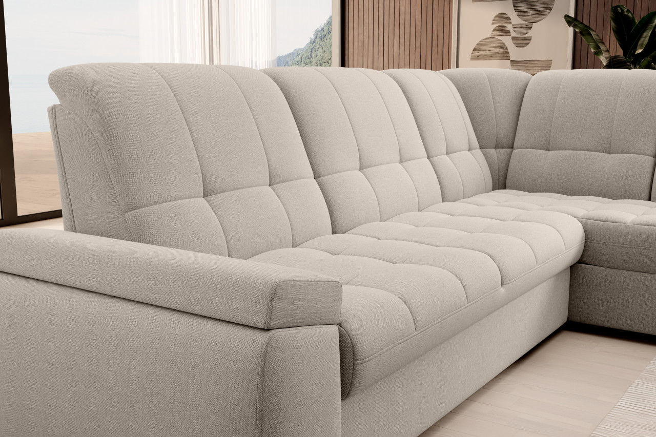 Sado este un colțar practic și confortabil, cu dimensiunile de 272x192x95 cm, gândit pentru relaxare zilnică - fie că urmărești un film, fie că citești o carte. Confortul este asigurat de spătarul profilat, precum și de cotierele comode. Modelul dispune de o funcție de dormit cu o suprafață de 207x130 cm, ce poate fi extinsă rapid și ușor datorită mecanismului tip „delfin”. În plus, lada de depozitare integrată în șezlong oferă un spațiu practic pentru a păstra lenjeria de pat. Dimensiuni: Lungime: 272 cm Adâncime: 192 cm Înălțimea cu perne: 95 cm Adâncime așezutului: 60 cm Înălțimea șezutului: 45 cm Funcție de dormit: 207x130 cm Produsul nu este montat, montarea este rapidă și ușoară. Produsul este personalizabil, culoarea și materialul se aleg pe baza paletarelor la cererea clientului. Prețul poate suferi modificări în funcție de grupa de material aleasă.