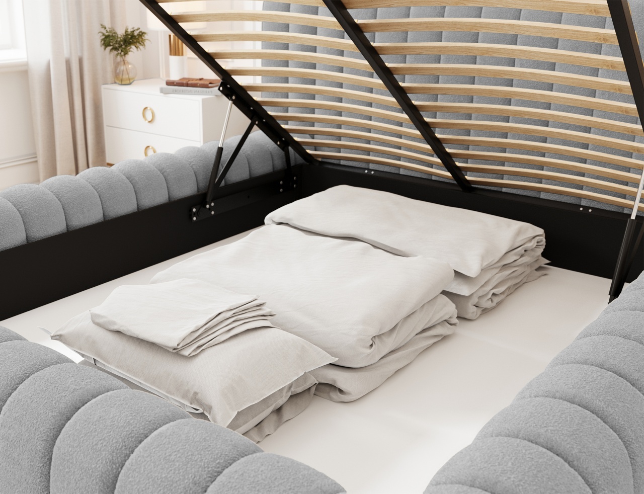 Patul Carilla este o piesă de mobilier modernă și elegantă, disponibilă în trei dimensiuni: 140x200 cm, 160x200 cm și 180x200 cm, integrându-se perfect în tendințele interioarelor contemporane. Confortul utilizării este asigurat de umplutura ramei și a tăbliei cu spumă poliuretanică de înaltă calitate T2130 și T2315, garantând durabilitate și confort. Construcția sa solidă se bazează pe un cadru metalic cu 36 de lamele, oferind un suport excelent pentru saltea și un somn odihnitor. Întregul ansamblu este completat de un glisor negru, care evidențiază stabilitatea și estetica piesei de mobilier. Dimensiuni: Lățime: 242 cm Lungime: 244 cm Înălțime: 93 cm Înălțime șezut: 42 cm Suprafață dormit: 180x200 cm Înălțime picioare: 2 cm Recipient depozitare lenjerie de pat: 200x180x19 cm Număr de lamele: 36 Spătar tapițat: nu Saltea inclusă: nu Produsul nu este montat, montarea este rapidă și ușoară. Produsul este personalizabil, culoarea și materialul se aleg pe baza paletarelor la cererea clientului. Prețul poate suferi modificări în funcție de grupa de material aleasă.
