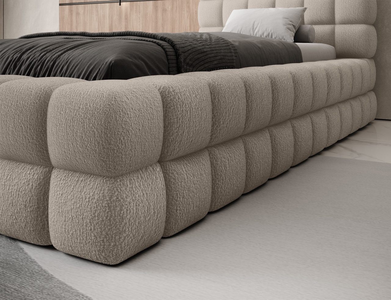Patul Dizzle, cu dimensiunile 225x134x103 cm, este o piesă de mobilier modernă și elegantă, care îmbină perfect confortul somnului cu soluții practice pentru utilizarea zilnică. Echipat cu umplutură de înaltă calitate din spumă T2130, oferă suport optim și confort în timpul odihnei, în timp ce picioarele solide, de culoare neagră, realizate din plastic rezistent, garantează stabilitate și rezistență la deteriorare. Un alt avantaj este lada de depozitare pentru lenjerie, spațioasă și ușor accesibilă, care ajută la menținerea ordinii în dormitor și la economisirea spațiului din dulapuri. Stilul modern al patului Dizzle îl face potrivit atât pentru interioare minimaliste, cât și pentru cele mai decorative, devenind punctul central al camerei și evidențiindu-i caracterul unic. Este alegerea ideală pentru cei care caută o combinație de estetică, funcționalitate și durabilitate într-o singură piesă de mobilier. Dimensiuni: Lungime: 225 cm Lățime: 134 cm Înălțime: 103 cm Produsul este personalizabil, culoarea produsului și materialul se aleg pe baza paletarelor. Prețul poate suferi modificări în funcție de materialul ales. Produsul nu este montat, este destinat pentru auto-asamblare. Instrucțiunile de montaj vin în colet.