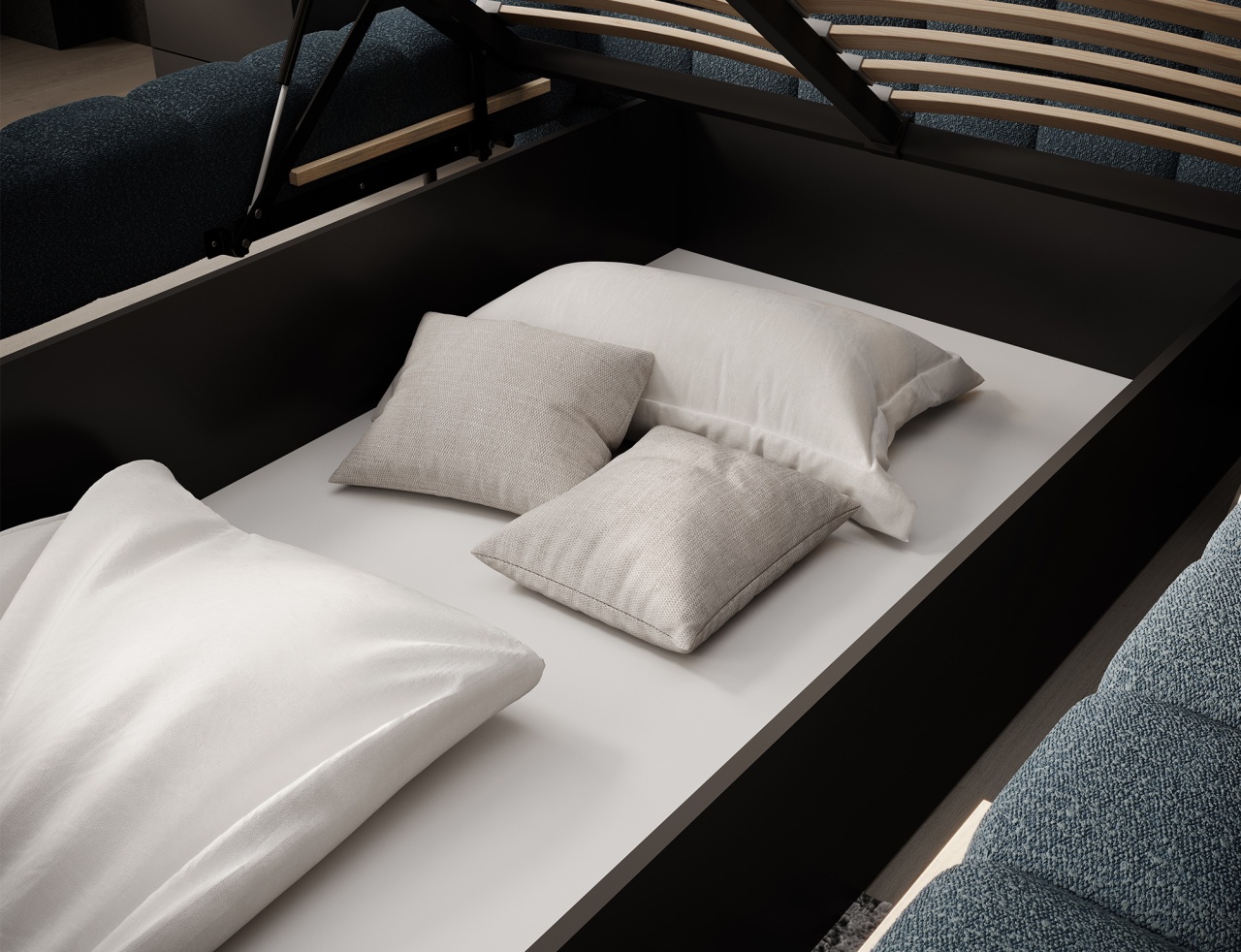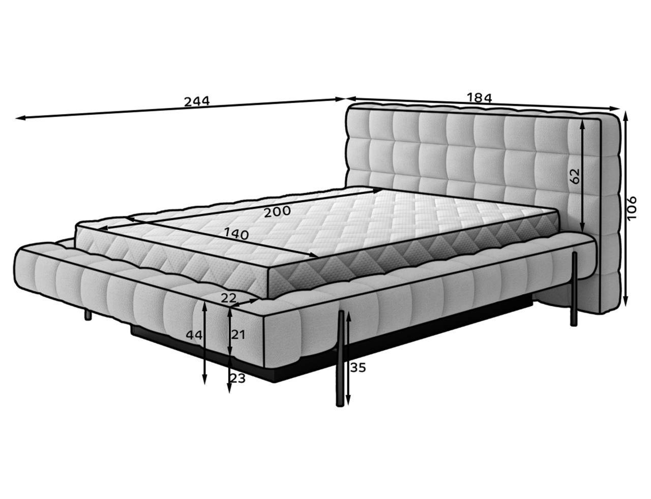 Patul Magentta reprezintă o combinație de design modern, funcționalitate și confort deosebit. Datorită spatelui tapițat, patul are un aspect extrem de elegant și adaugă o notă de căldură oricărui dormitor. Structura solidă și spătarul umplut cu spumă T2130 oferă un suport excelent și confort atât pentru somn, cât și pentru relaxare. Modelul este disponibil în trei dimensiuni: 140 cm, 160 cm și 180 cm, permițând adaptarea acestuia la dimensiunea camerei și la preferințele individuale. Cadru metalic include 36 de lamele care susțin uniform salteaua (se achiziționează separat), sporind durabilitatea construcției și confortul utilizării. Piciorul negru din metal oferă o bază solidă și accentuează caracterul minimalist și modern al patului. Un avantaj suplimentar este lada de depozitare pentru lenjerie, care permite stocarea practică a plapumilor, pernelor sau altor textile, economisind spațiu în cameră. Patul Magentta este alegerea ideală pentru cei care apreciază stilul modern, confortul și soluțiile funcționale. Dimensiuni: Lățimea: 184 Lungimea: 244 cm Înălțimea: 106 Înălțimea șezutului: 44 cm Suprafață de dormit: 140x200 cm Înălțimea picioarelor: 21 cm Recipient pentru depozitarea așternuturilor: 177x100x29cm Salteaua NU este inclusă! Produsul nu este montat, montarea este rapidă și ușoară. Produsul este personalizabil, culoarea și materialul se aleg pe baza paletarelor la cererea clientului. Prețul poate suferi modificări în funcție de grupa de material aleasă.