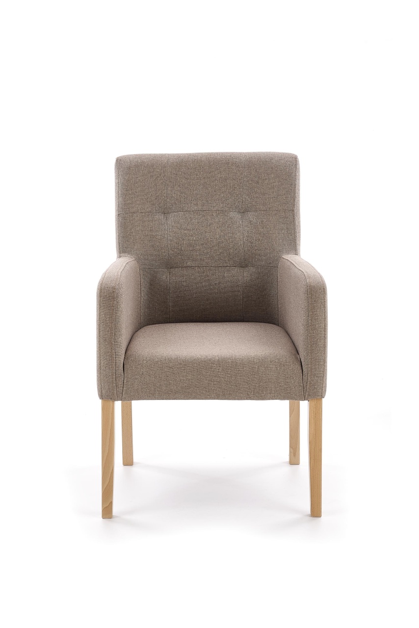 Fotoliu tapitat Filo bej Fotoliul Filo este tapitat cu stofa de inalta calitate, cadrul fiind realizat din lemn masiv de fag. In stil modern, confortabil si elegant, este ideal pentru camera de zi, dormitor, zone de relaxare, cafenele, birouri. Dimensiuni: 60cm 62cm 92cm 45cm Produsul nu este montat, este destinat pentru auto-asamblare. Instructiunile de montaj vin in colet.