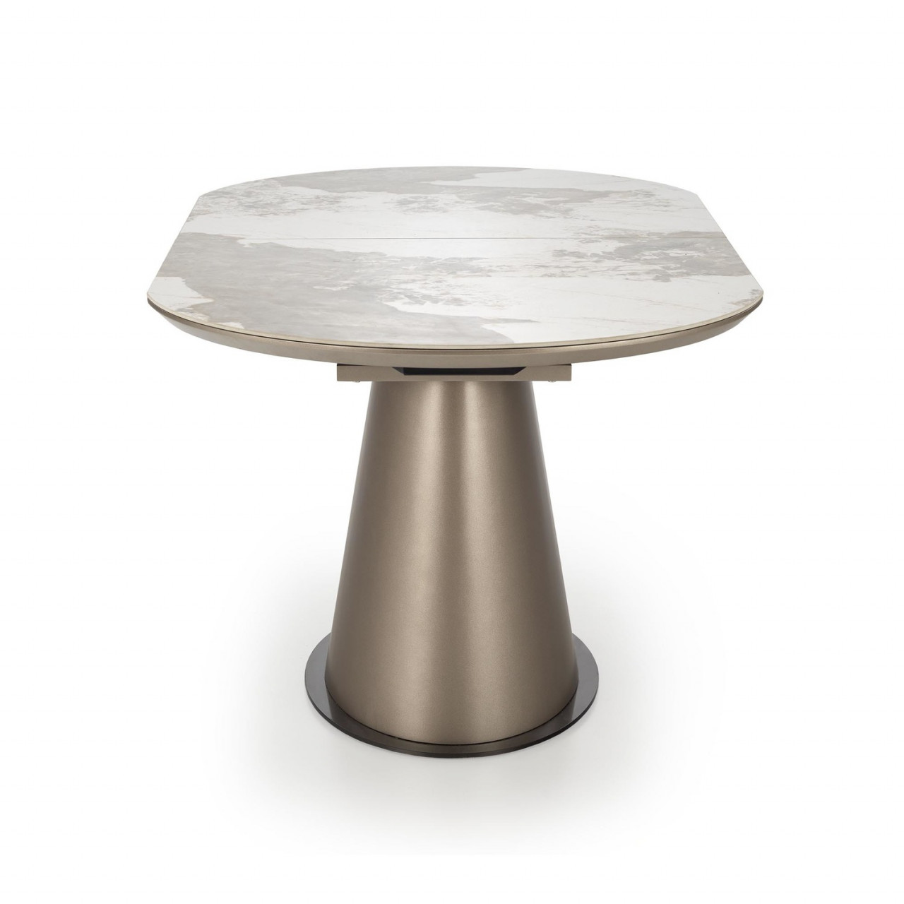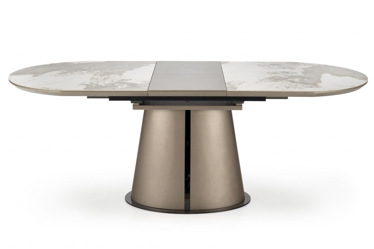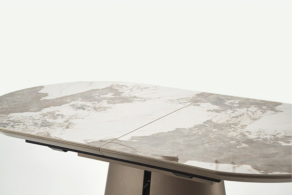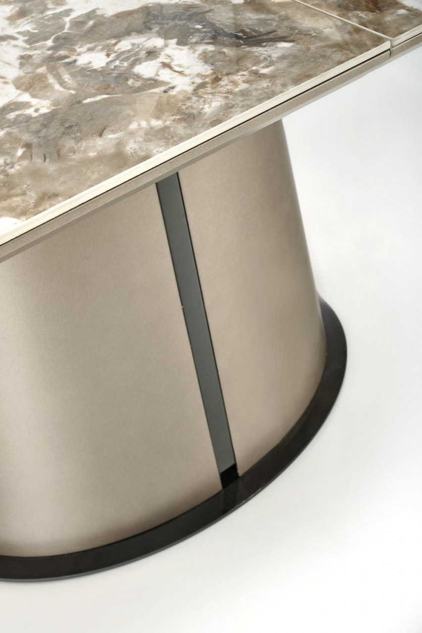 Masa extensibila Robinson are un un design elegant, fiind potrivita pentru interioarele moderne si clasice. Se integreaza perfect in livingul tau oferindu-i o nota de eleganta si spatiu suficient pentru mesele in familie. Este alegerea perfecta pentru cei care opteaza pentru un aspect glamour. Dimensiuni: Latime: 90 cm Lungime: 160-200 cm Inaltime: 76 cm Detalii tehnice: material : Ceramica / MDF / Otel vopsit Culoare: Blat: marmura bej / cappuccino Picior: cappuccino / negru Scaunele din imaginile de prezentare nu sunt incluse in pret. Produsul nu este montat, este destinat pentru auto-asamblare. Instructiunile de montaj vin in colet.