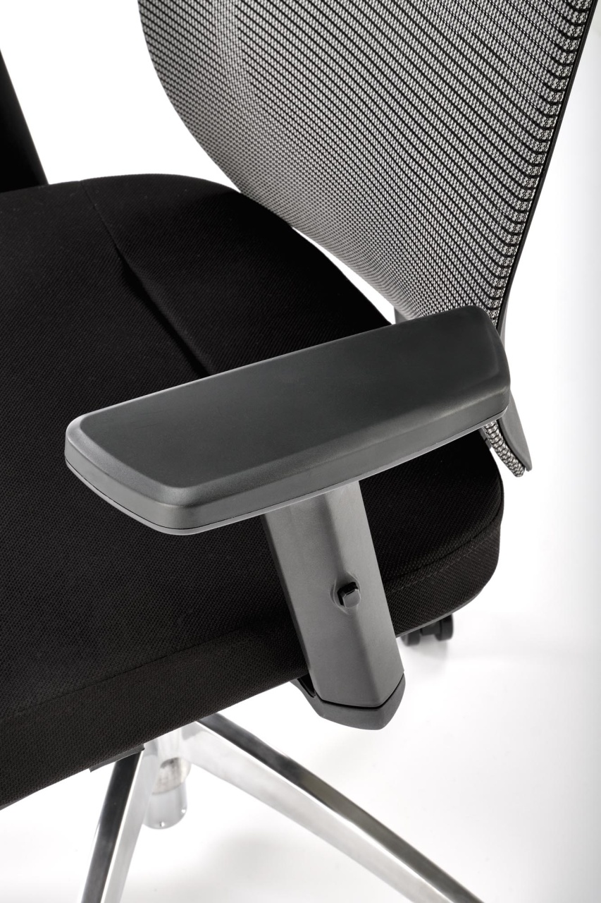 Scaun de birou Admiral negru gri Scaunul de birou Admiral are un design ergonomic, funcional si foarte practic. Tapiteria din material este foarte confortabila, placuta la atingere si permitand circulatia aerului. Scaunul este echipat cu mecanism multiblock care permite balansarea si reglarea fina a inaltimii, blocarea spatarului in pozitia verticala si rotirea in jurul propriei axe. Cotierele, suportul pentru cap si suportul lombar sunt reglabile si asigura o pozitionare confortabila a trupului. Baza solida din aluminiu formata din cinci brate este echipata cu roti concepute pentru suprafetele moi. Dimensiuni: 64 60 115-125 46-56 Latime: 64 cm Adancime: 60 cm Inaltime totala: 115-125 cm Inaltime pana la sezut: 46-56 cm Produsul nu este montat. Instructiunile de montaj se gasesc in colet.