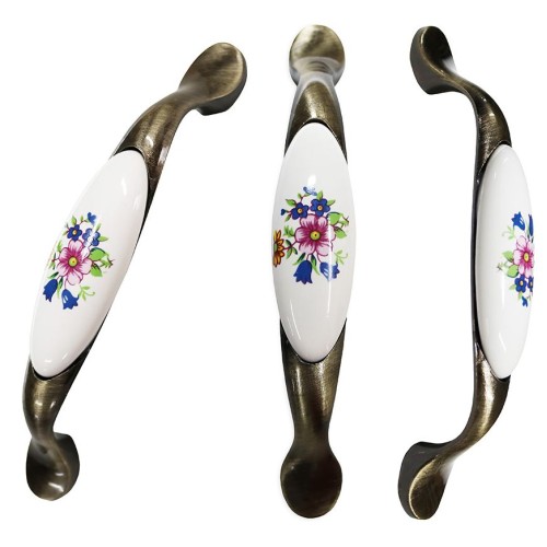 Maner din aliaj de zinc placat cu alama antica si ornament din ceramica printat cu model floare roz. Include suruburi pentru prindere pe frontul de mobila (usa sau sertar) de 18 mm. Pretul este pentru o cutie de 50 de bucati. CARACTERISTICI Dimensiune intre gauri: 96 mm Greutate: 43.6 grame